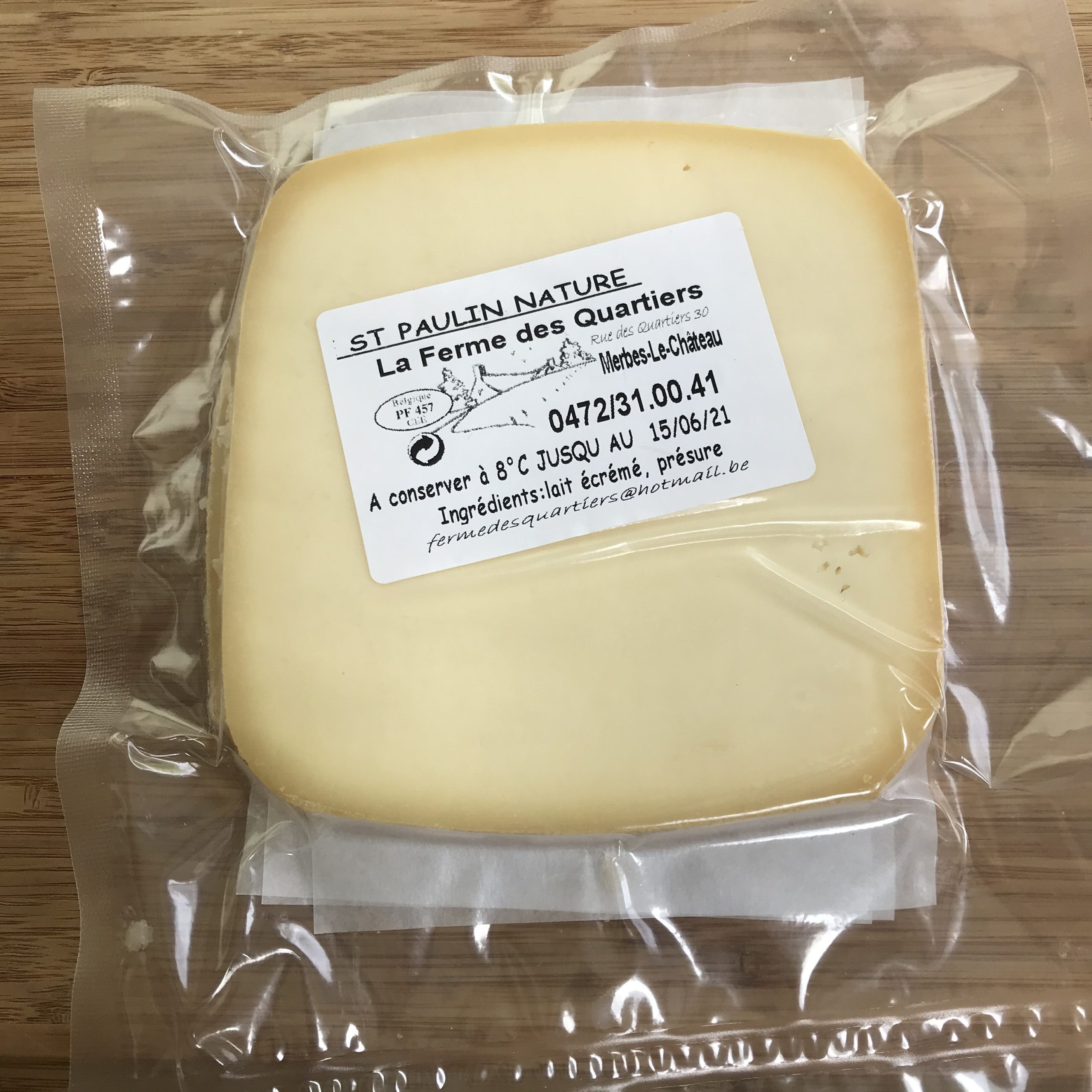 Fromage de type Saint Paulin de la ferme des quartiers en portions d’environ 250 gr (bloc ou tranches) à 25€ le kg.